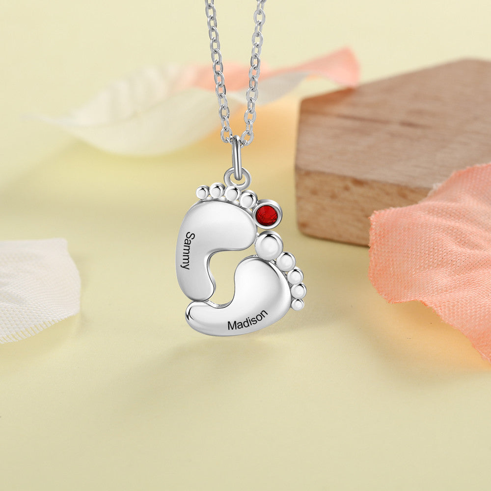 Personalised Baby Feet Necklace with Two Names & Birthstone – Custom Engraved Gift for Mum or Grandma